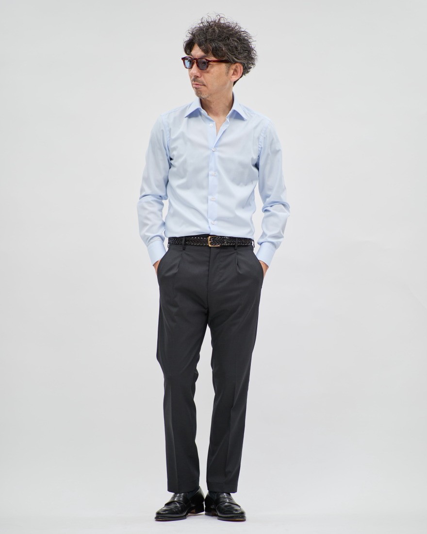 生地には、薄手ながらもしっかりとしたハリとコシ、そして柔らかさを兼ね備えたポリエステルウールストレッチ素材を使用。さらりとした落ち感とややマットな風合いの織地は、シーズンを問わず一年を通して活躍する汎用性の高さが魅力です。