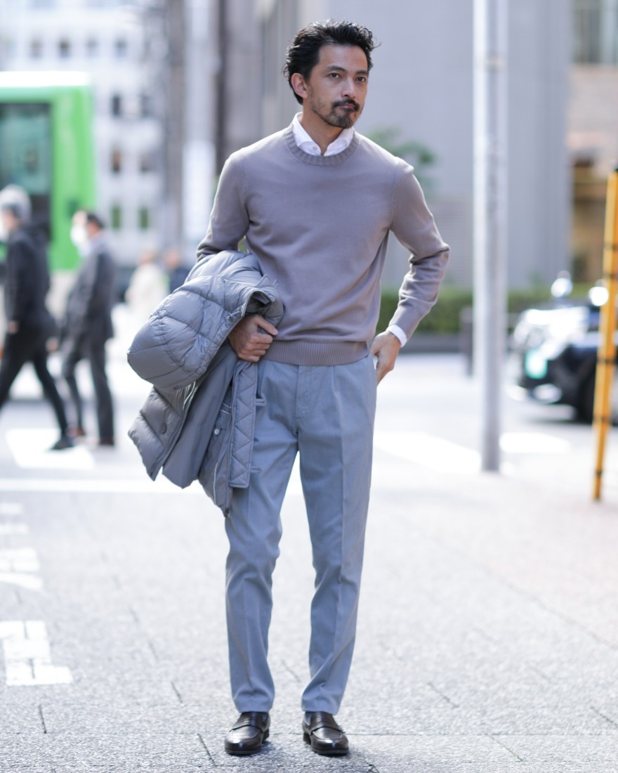 モデルサイズ:身長174cm/体重65kg/頭囲58cm/肩幅42cm/胸囲90cm/ウエスト78cm/ヒップ91cm/太もも53cm /手囲い23cm 着用サイズ:44/グレー