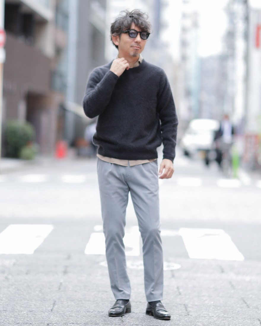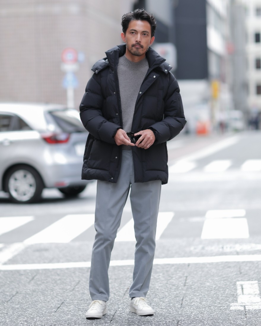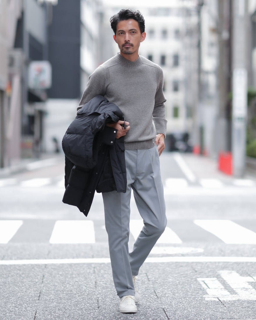 モデルサイズ:身長174cm/体重65kg/頭囲58cm/肩幅42cm/胸囲90cm/ウエスト78cm/ヒップ91cm/太もも53cm /手囲い23cm 着用サイズ:44/グレー