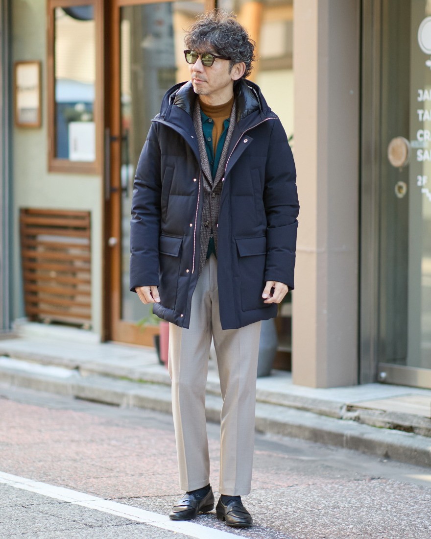 モデルサイズ:身長185cm/体重73kg/肩幅48㎝/胸囲95cm/ウエスト80cm/ヒップ96cm 着用サイズ:50