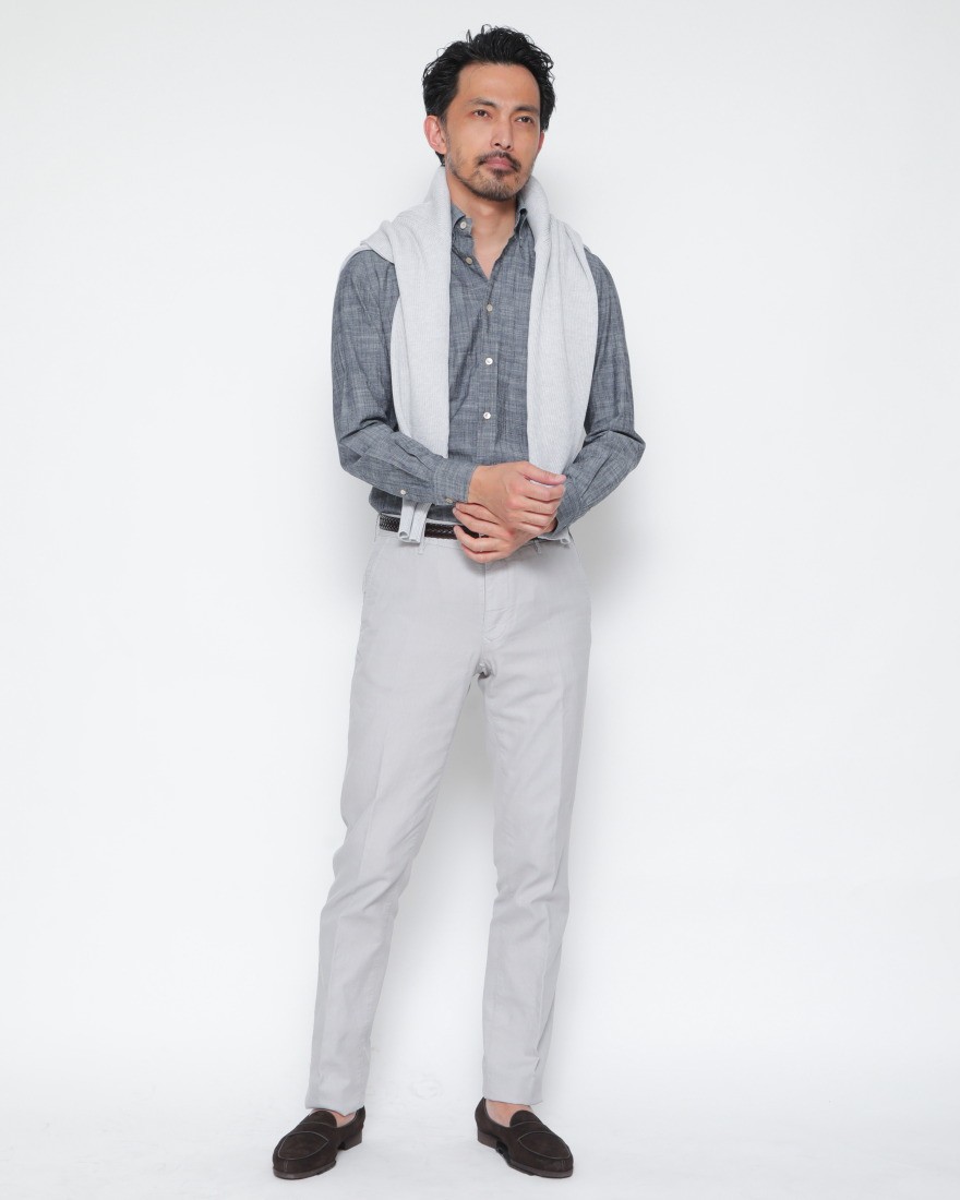 インコテックスの数あるパンツ中でも、絶大な人気を誇る「100」番シリーズのコットンリネンドレスチノ。その魅力は、春夏に最適な軽快さと、上質な風合いを両立している点にあります。