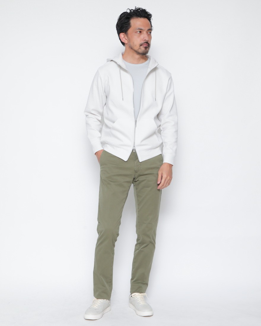 INCOTEXが長年展開し、絶対的な人気を誇る定番のスリムフィットチノ。 股上をやや浅めに、腰位置のウエストバンドを高く設定することで、ヒップラインを美しく持ち上げる独自のパターンが最大の特徴です。もたつきを一切感じさせないシャープなシルエットが、脚のラインを驚くほどスマートに演出します。