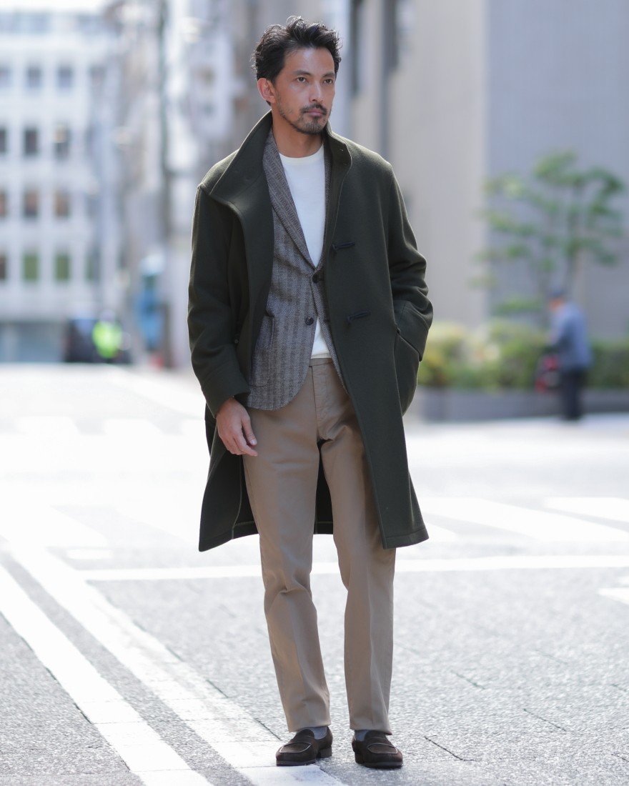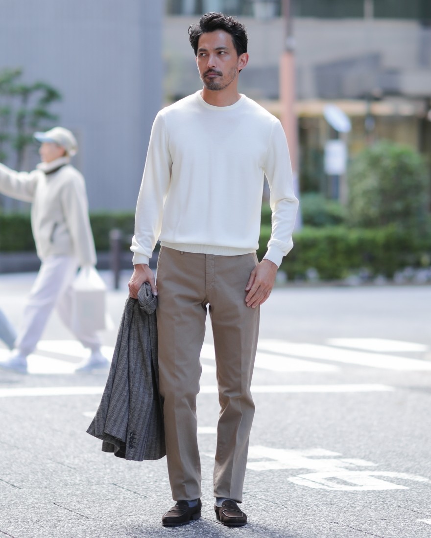素材には、高密度に織り込まれた上質なコットンストレッチツイルを採用。適度な厚みと滑らかな質感を両立しています。繊細なムラ感を持つ、豊かな表情が、このモデルの個性を際立たせています。ストレッチが効いているため、動きやすさも抜群です。