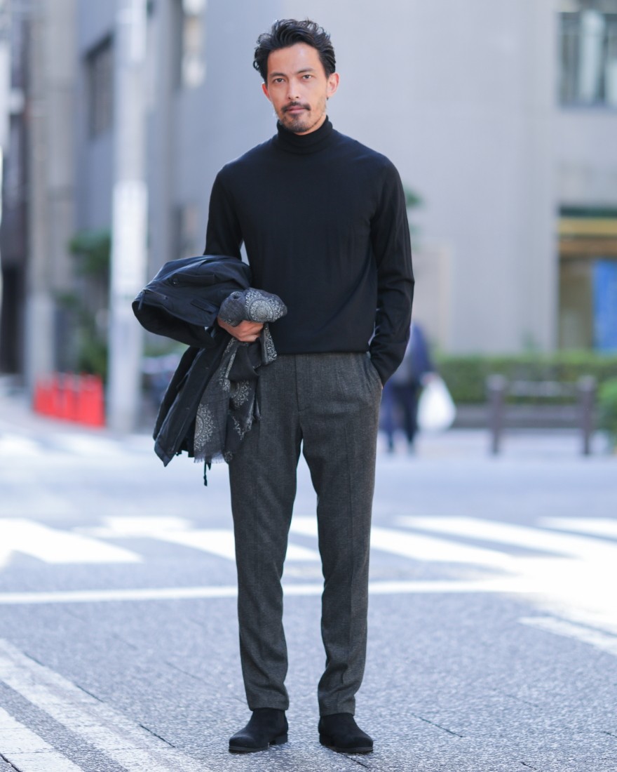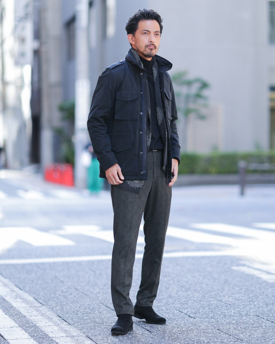 モデルサイズ:身長185cm/体重73kg/肩幅48㎝/胸囲95cm/ウエスト80cm/ヒップ96cm 着用サイズ:50