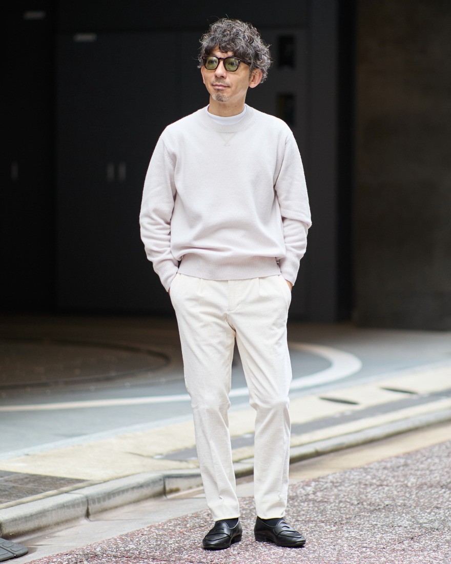 モデルサイズ:身長174cm/体重65kg/頭囲58cm/肩幅42cm/胸囲90cm/ウエスト78cm/ヒップ91cm/太もも53cm /手囲い23cm 着用サイズ:44/オフホワイト