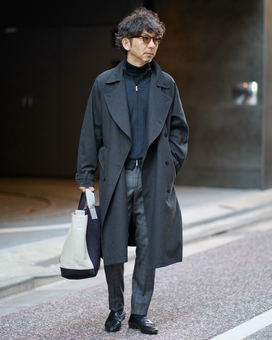 素材には、トップ糸とベタ染め糸を組み合わせ、深みのある複雑な色合いを表現した「トップウールコットン」を採用。繊細なドビー織りでさりげなく浮かび上がるシャドーチェックが上品さを演出し、グレーデニムのようなカジュアルな風合いも楽しめます。