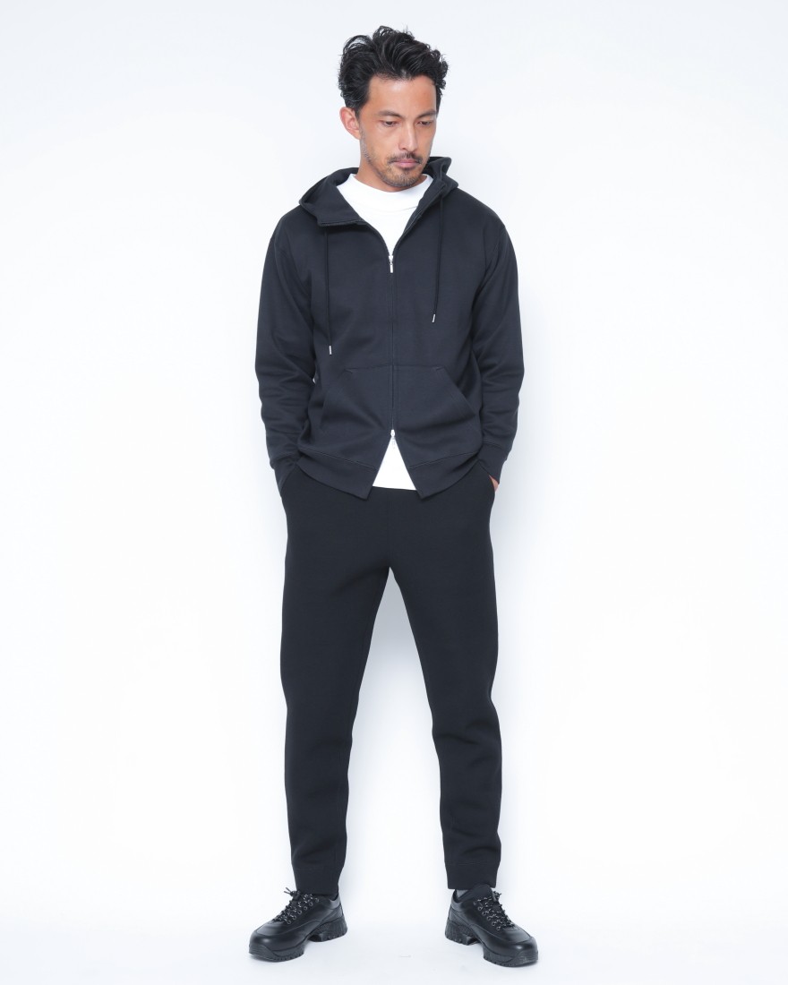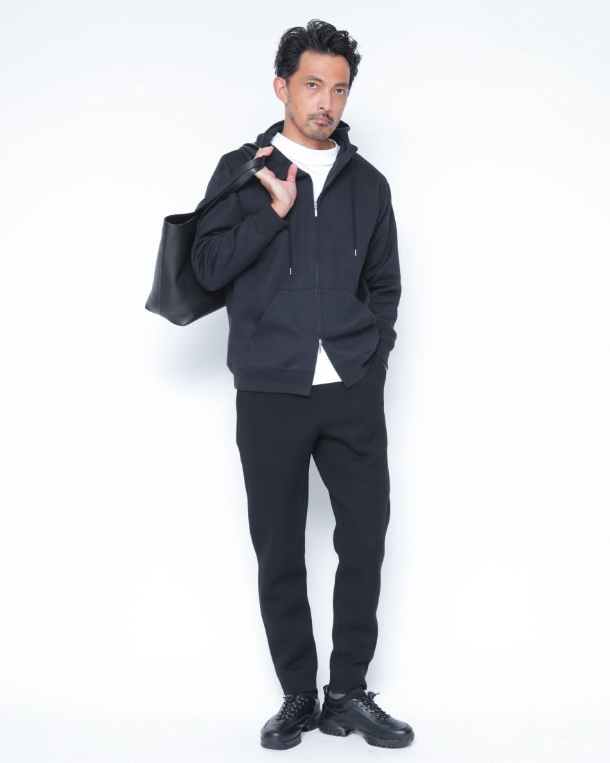 ハリのある高密度ダブルニットが美シルエットをキープ。リラックス感と上品さを併せ持つ、大人のドレスジョガー