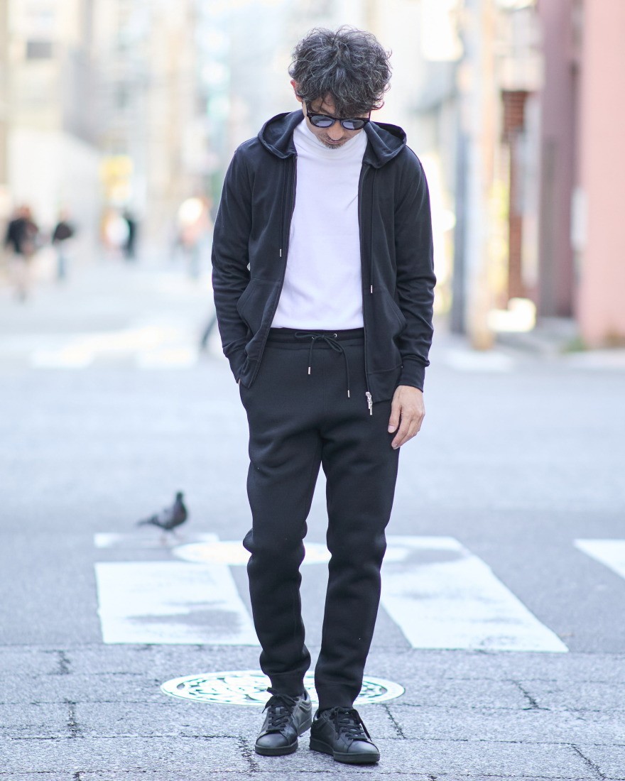 モデルサイズ:身長185cm/体重73kg/肩幅48㎝/胸囲95cm/ウエスト80cm/ヒップ96cm 着用サイズ:L/ブラック