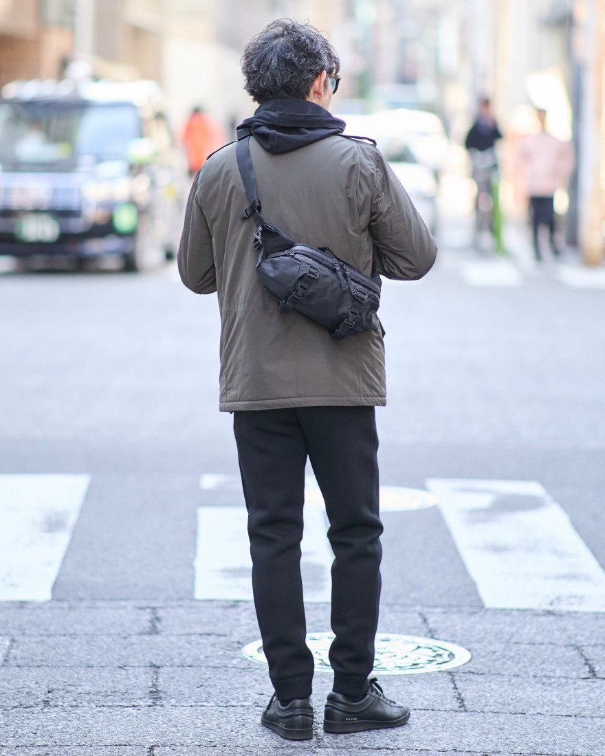 モデルサイズ:身長174cm/体重65kg/肩幅42cm/胸囲91cm/ウエスト76.5cm/ヒップ91cm/太もも54.5cm 着用サイズ:42/ブラック/ブラック