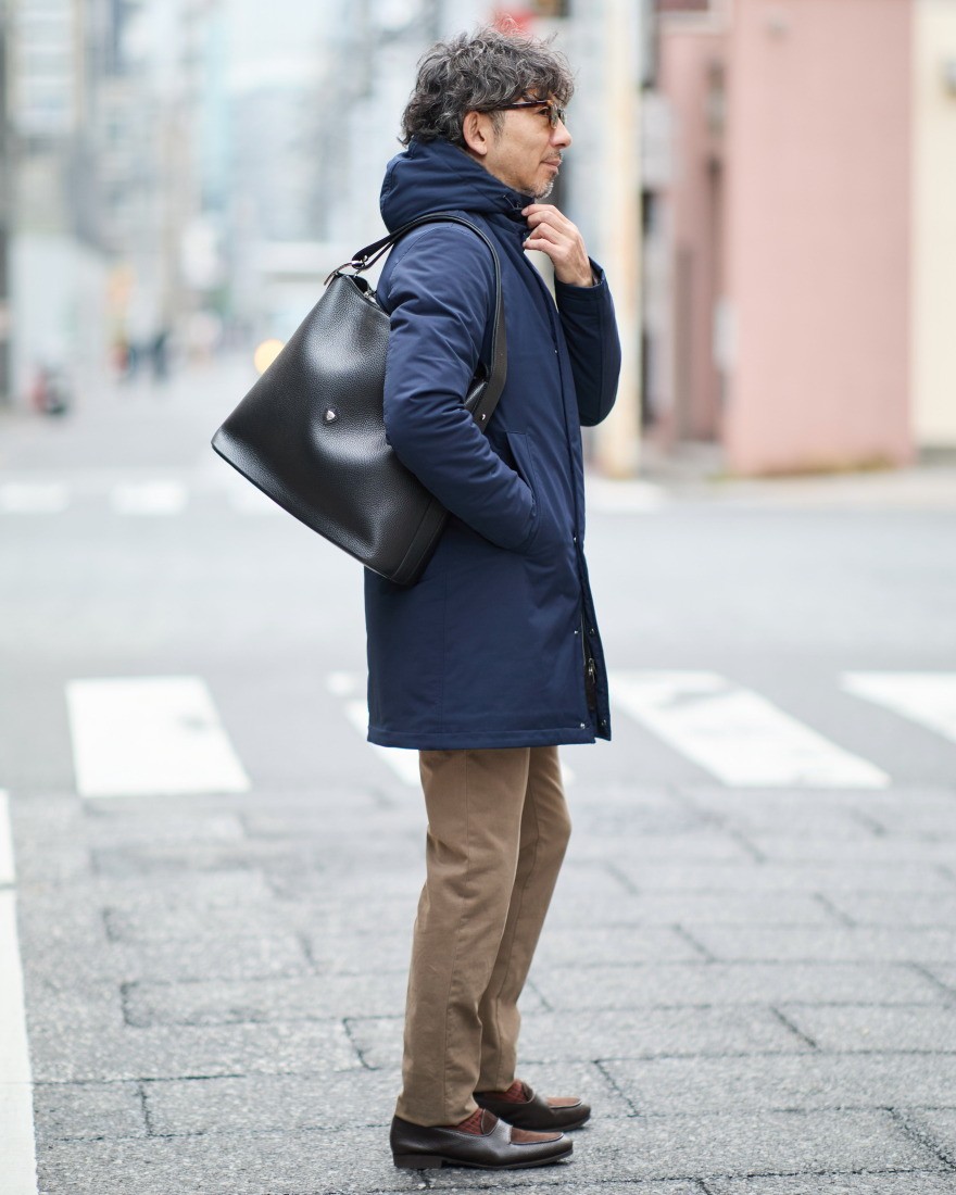 背面サイドには財布やスマートフォンの収納に便利なジップポケット付き。シンプルなデザインはビジネスシーンはもちろん、休日のカジュアルスタイルにも合わせやすい、汎用性の高いアイテムです。