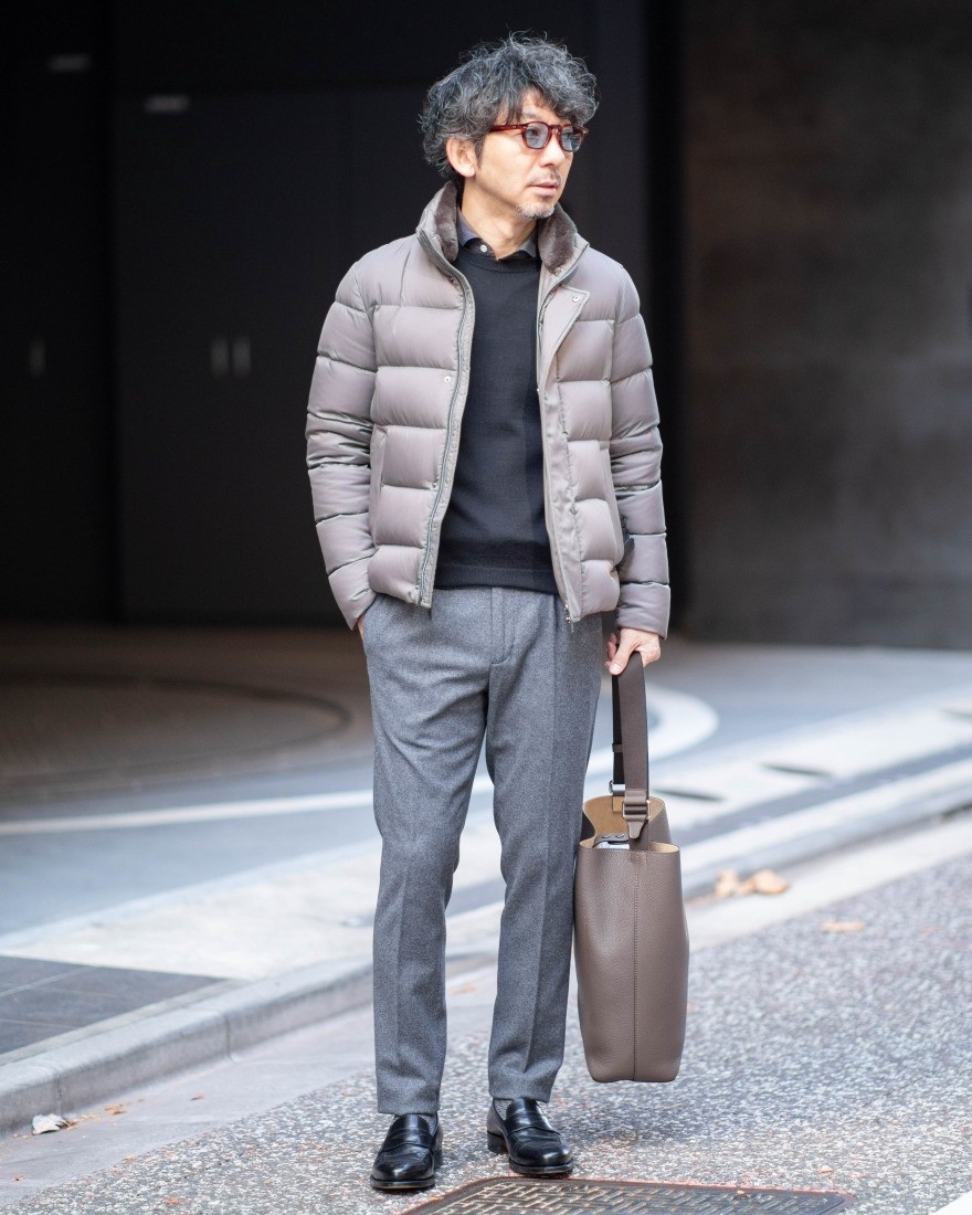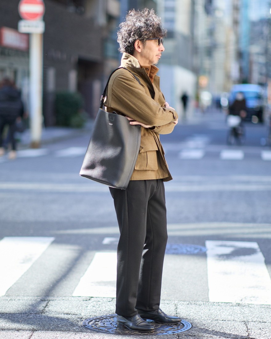 その肝となるのが、ブランドオリジナルのシボ革「ALCE(アルチェ)」に贅沢にスエードを貼り合せたダブルフェイス素材です。内側にスエードを貼り合せることで、シボ革の柔らかな風合いを残しつつ、しっかりとしたハリが生まれるため、型崩れしにくく美しいフォルムをキープ。この独特の質感が、風格を生み出しています。