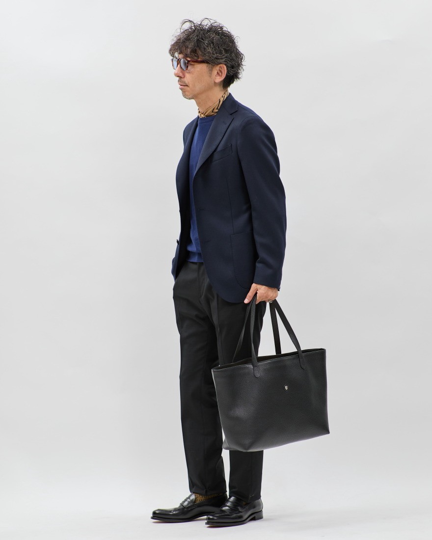 こちらは横長の美しいフォルムが魅力のラージトートバッグです。マチ幅がありノートパソコンの持ち運びにはもちろん、一泊二日程度の旅行などにも便利な大容量サイズ。素材には程よい厚みのある上質なシュリンクレザーを採用。艶やかな光沢と表面感を持つ滑らかな風合いが、ラグジュアリームードを漂わせる一方、どこかこなれた印象を感じさせるのも魅力。シンプルなデザインだから、ユニセックスでの使用も可能です。