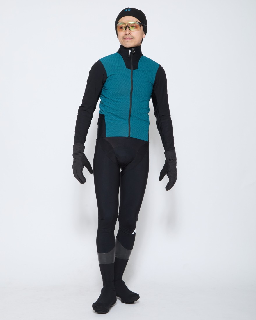 ASSOSで最も暖かい防風素材「AIR BLOCK-EVO.916」がメインに採用され、防風/透湿/保温を一枚で担います。