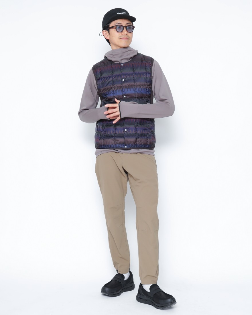 また、サイドをダウン無しにすることで、インナーダウンとして着用した際に起こりがちな「着膨れ感」を大幅に軽減。