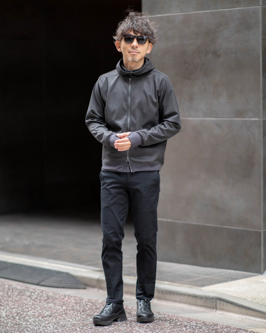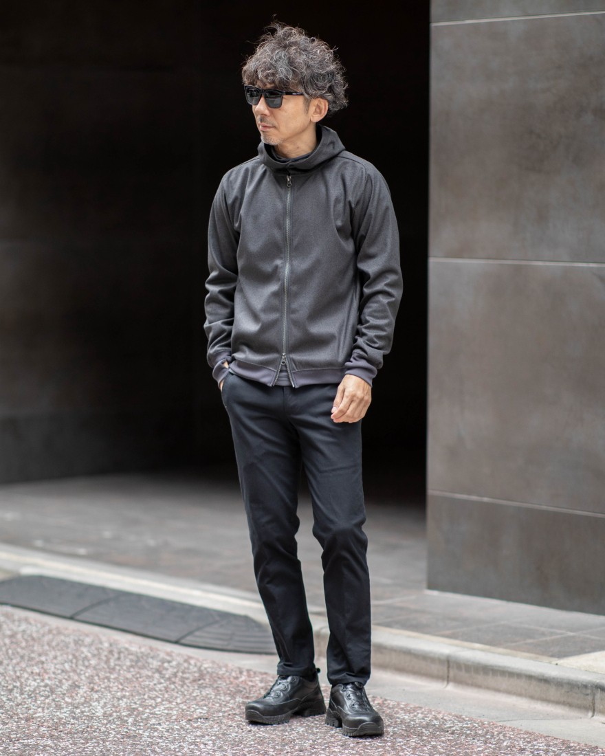 まるでウールのような風合いを持ちながら、ポリエステル100%で仕立てたジップパーカー。定番のプルオーバーパーカーのシルエットを基調とし、ウールにはない軽さと優れたストレッチ性で、軽快な着心地を実現しました。