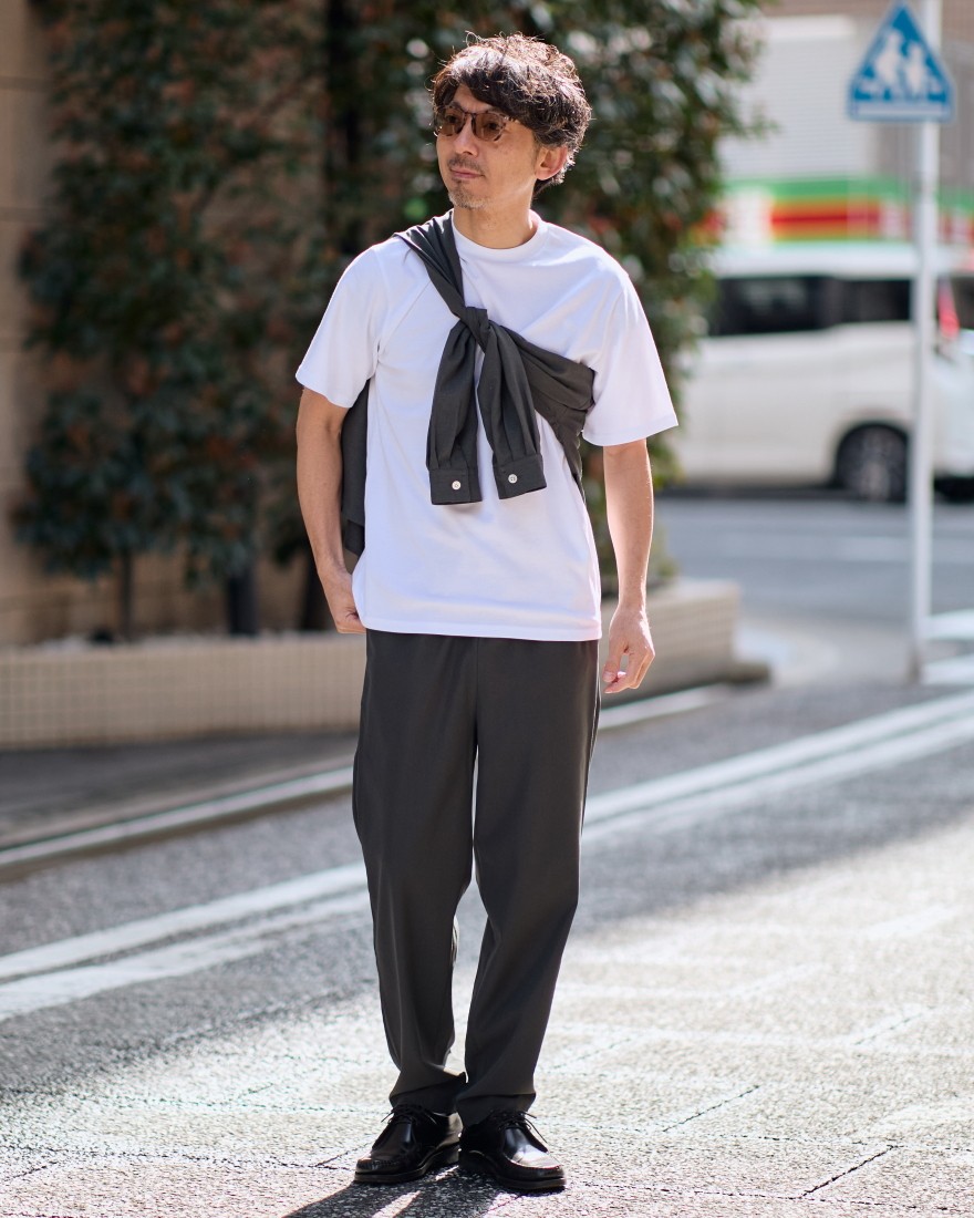 サイズ感もややゆとりのあるレギュラーフィットで、シンプルになりがちなTシャツスタイルを程よく抜け感あるスタイルに昇華してくれる一枚です。