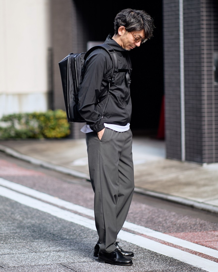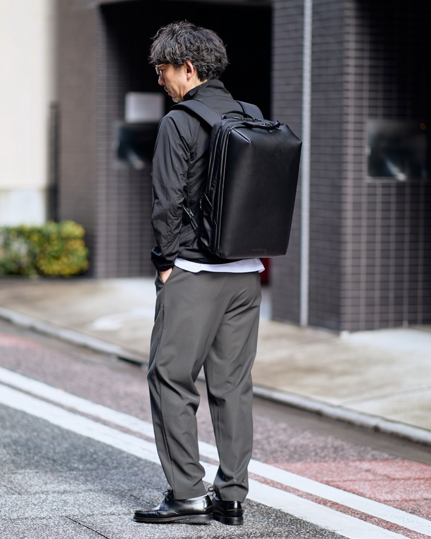 「ブランド×タンナー×生産地」の三位一体により実現した「軽くて水に強いレザーバッグ」という新たな機能美を纏い、自由度の高い約14Lのフロントスペースと、PC2台収納や着脱式テックポーチを備えた約10Lのガジェット専用スペースからなる2層構造を採用。