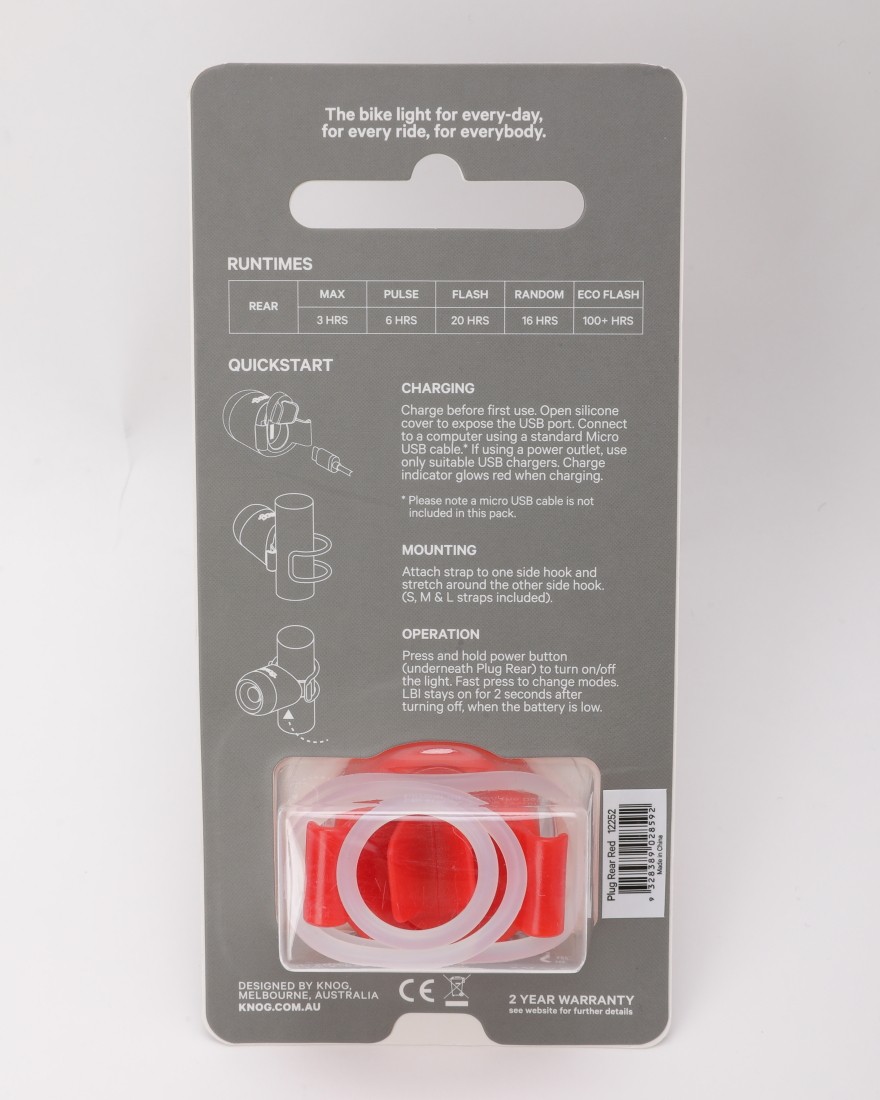 Knogのすべての自転車用ライトと同様に、プラグは100%充電可能です。充電は、大きな背面ボタンの後ろにある便利なマイクロUSBポートを使用して行います。 マイクロUSBケーブル(付属していません)を使用すると、USBポートで簡単に再充電できます。